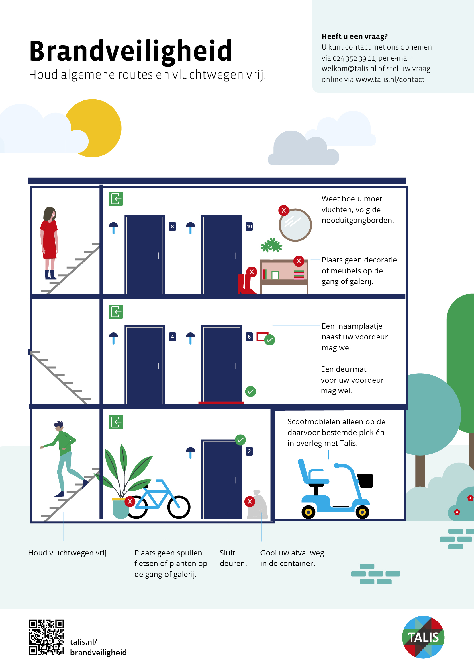 Talis zorgt dat uw woning voldoet aan de regels voor brandveiligheid. Die regels staan in het Bouwbesluit. Onze woningen voldoen aan die regels. In onze hoogbouw controleren we regelmatig of alles nog veilig is.